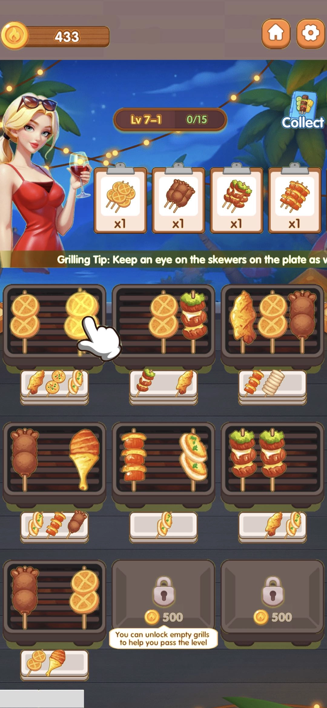 Observe the needs of visiting guests, match three identical skewers together, and you’ll complete the order and successfully serve the guests.